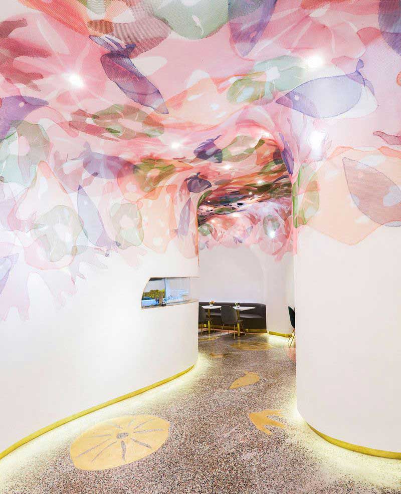 位于北京的Blufish餐厅拥有最令人惊叹和难忘的天花设计之一。餐厅的内部由SODA建筑师设计,以反映水生生物的主题。建筑师通过用各种不同颜色的网状装置装饰天花板,设法创造了一个神奇的海底世界,形状让人想起鱼,水母等等,餐厅还在地板上画有手绘草图,描绘了珊瑚,水生植物和鱼类。
